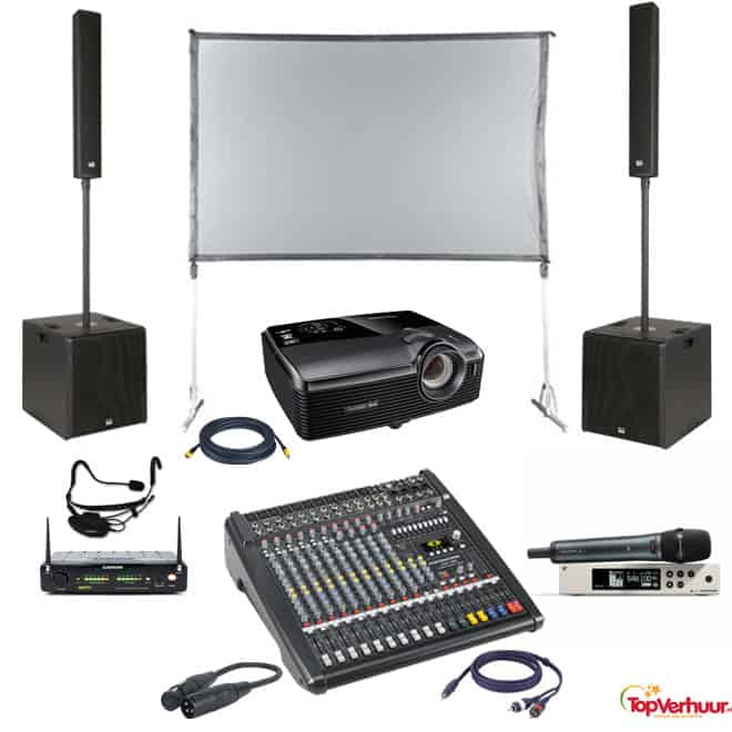 Complete presentatie-set incl. beamer & scherm en geluid-set met draadloze microfoon.